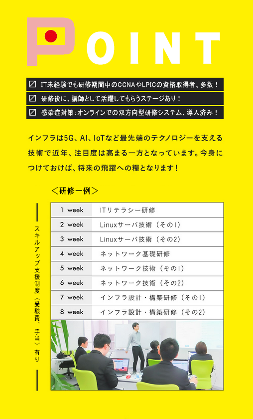 高い資格取得率を誇るネットワーク研修、サーバー研修を中心に、ITに関わる人材の育成に必要と考える教育研修を充実させていきます。